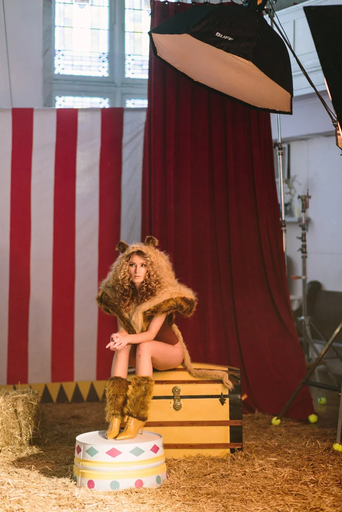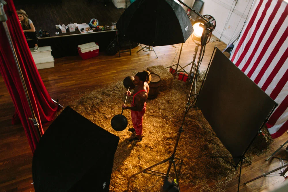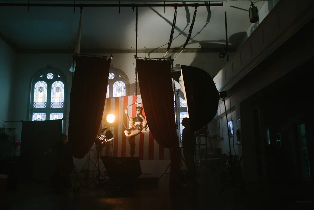 When we are coming up with a concept for a self produced shoot, this is our time to EXPERIMENT! We think BIG. The circus shoot was probably our biggest yet. Not in terms of crew members, but there were a lot of moving pieces. Every shoot contained its own challenges, and that’s the point. For example, our model, Navia, who played aerialist (modeling in the lyra - the round hoop hanging from the ceiling about 8 feet from the ground) character had no lyra experience. Not only did she have to get comfortable hanging out, but she was also posing suspended in a ring up in the air. It was extremely uncomfortable for her, and we had to take a lot of precautions to make sure she was safe. So getting the shot was time consuming, but Navia made it look beautiful.